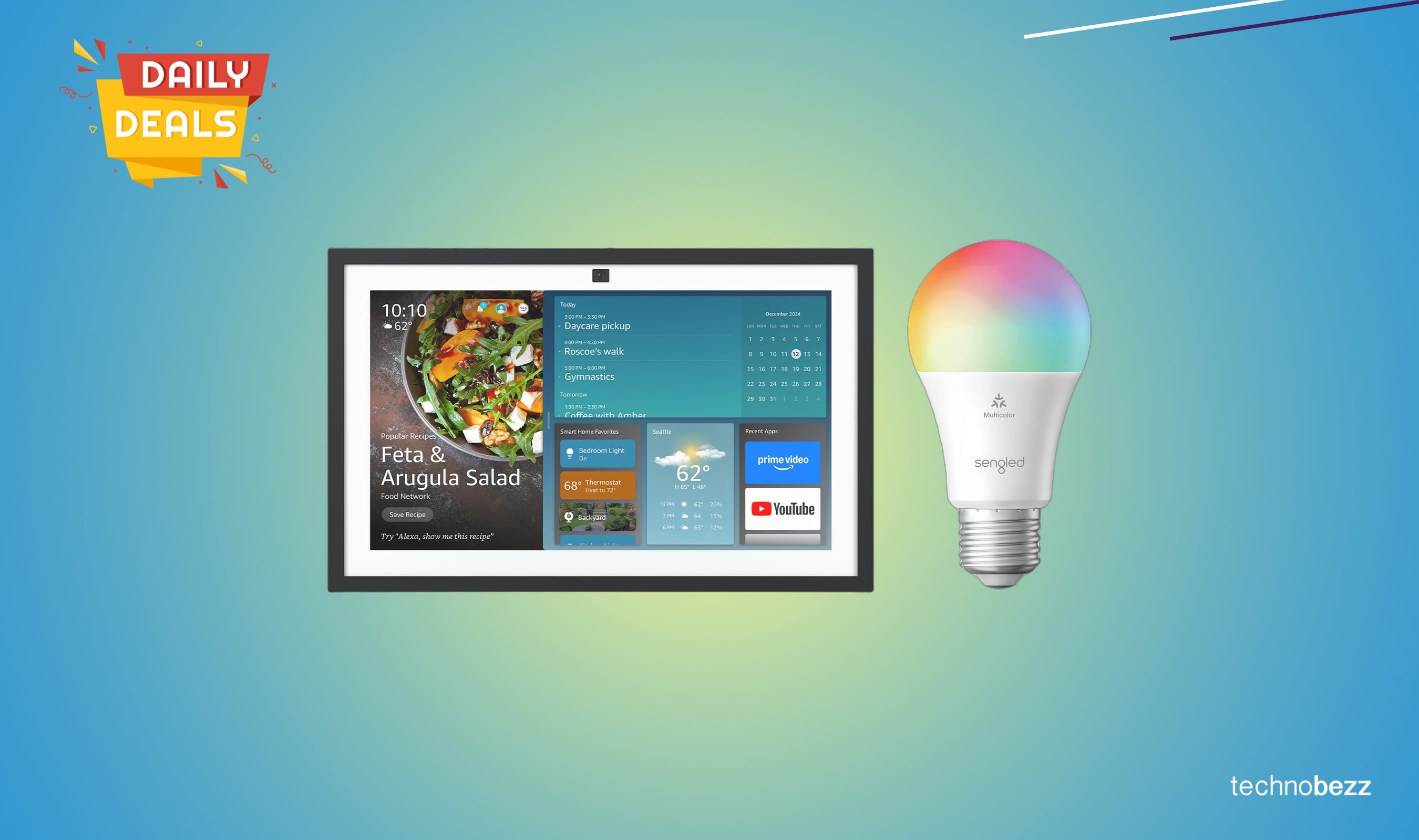The bundle includes the Echo Show 15 smart display and a Sengled LED Smart Light Bulb (A19). The Echo Show 15 features a 15.6-inch Full-HD (1080p) display designed for kitchen use with customizable widgets for daily organization.