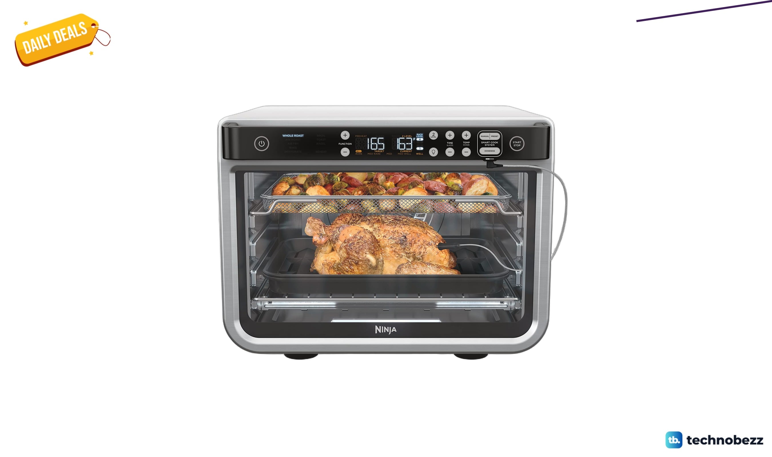 The DT251 packs True Surround Convection, which delivers up to 10 times the convection power of a traditional full-size oven for faster, crispier results. It offers 10 cooking functions: Air Fry, Air Roast, Bake, Whole Roast, Broil, Toast, Bagel, Dehydrate, Reheat, and Pizza. The built-in Foodi Smart Thermometer takes the guesswork out of cooking meat by letting you dial in doneness from rare to well done at the touch of a button. The oven preheats in 90 seconds and cooks up to 30% faster than a conventional convection oven.